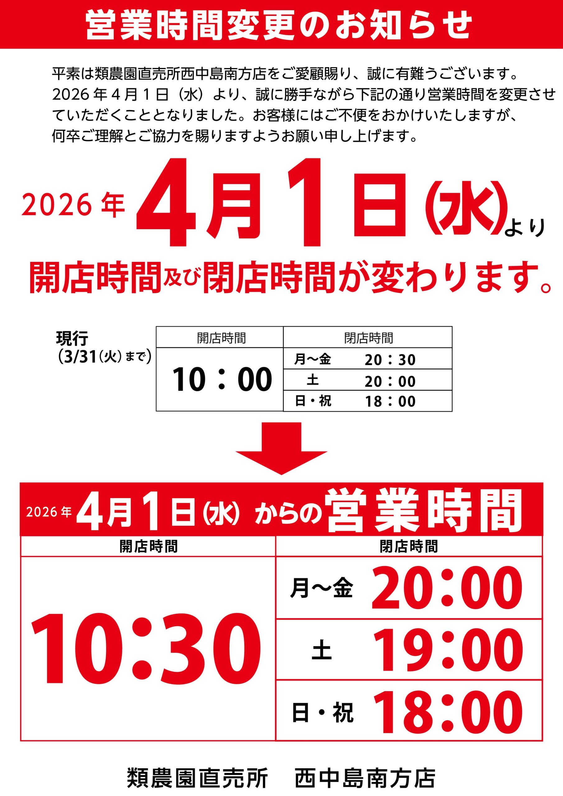4/1(水)より、西中島南方店の営業時間を変更いたします